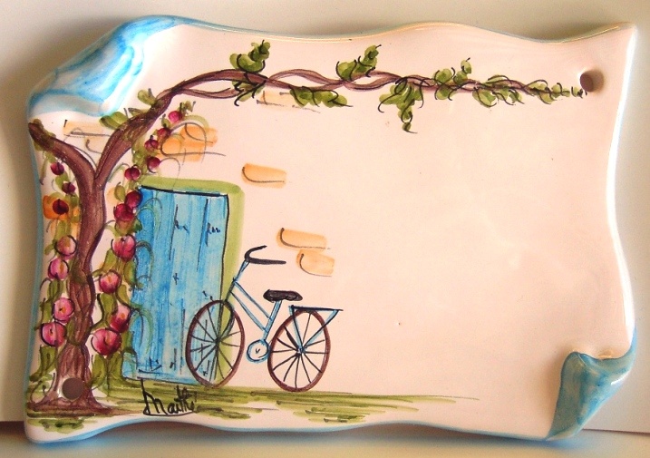 Plaque numéro de maison en céramique artisanale petit modèle motif Bicyclette bleue NPM00173